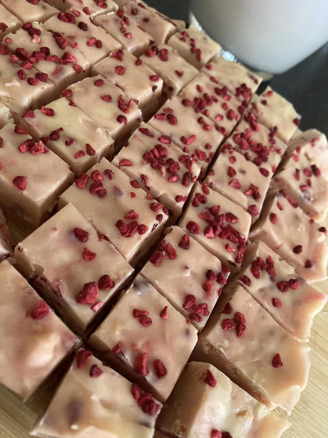 Creamy fudge made with a white chocolate base, with freeze dried raspberries throughout.